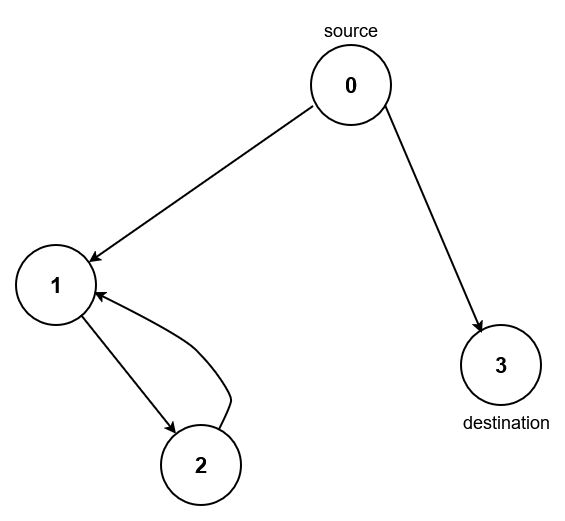 Input: n = 4, edges = [[0,1],[0,3],[1,2],[2,1]], source = 0, destination = 3