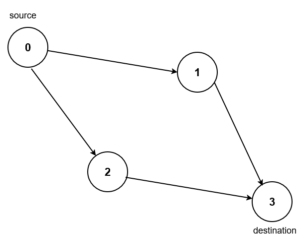 Input: n = 4, edges = [[0,1],[0,2],[1,3],[2,3]], source = 0, destination = 3