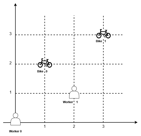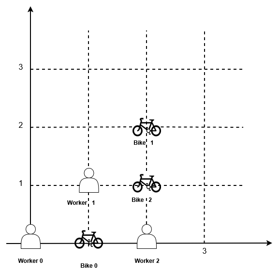 If there are multiple (workerᵢ, bikeⱼ) pairs with the same shortest Manhattan distance, we choose the pair with the smallest worker index. If there are multiple ways to do that, we choose the pair with the smallest bike index. Repeat this process until there are no available workers.