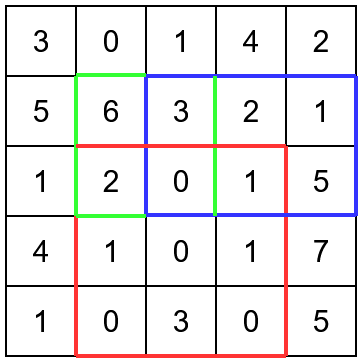 numMatrix.sumRegion(2, 1, 4, 3); // return 8 (i.e sum of the red rectangle)