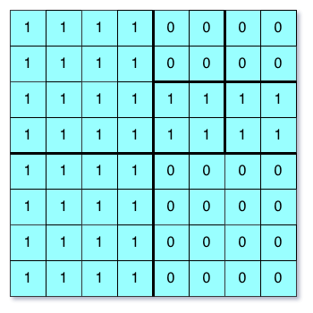 Output: [[0,1],[1,1],[0,1],[1,1],[1,0],null,null,null,null,[1,0],[1,0],[1,1],[1,1]]Explanation: All values in the grid are not the same. We divide the grid into four sub-grids.