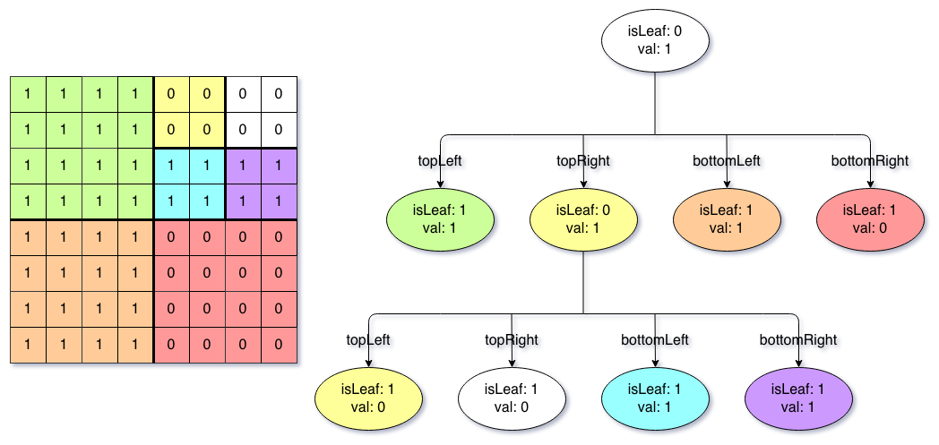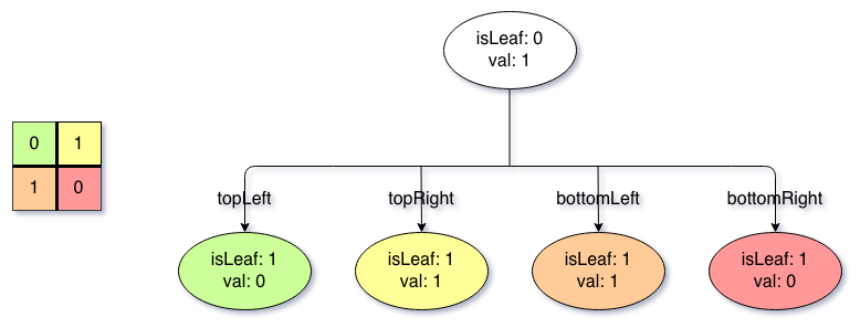 val: True if the node represents a grid of 1's or False if the node represents a grid of 0's. Notice that you can assign the val to True or False when isLeaf is False, and both are accepted in the answer.